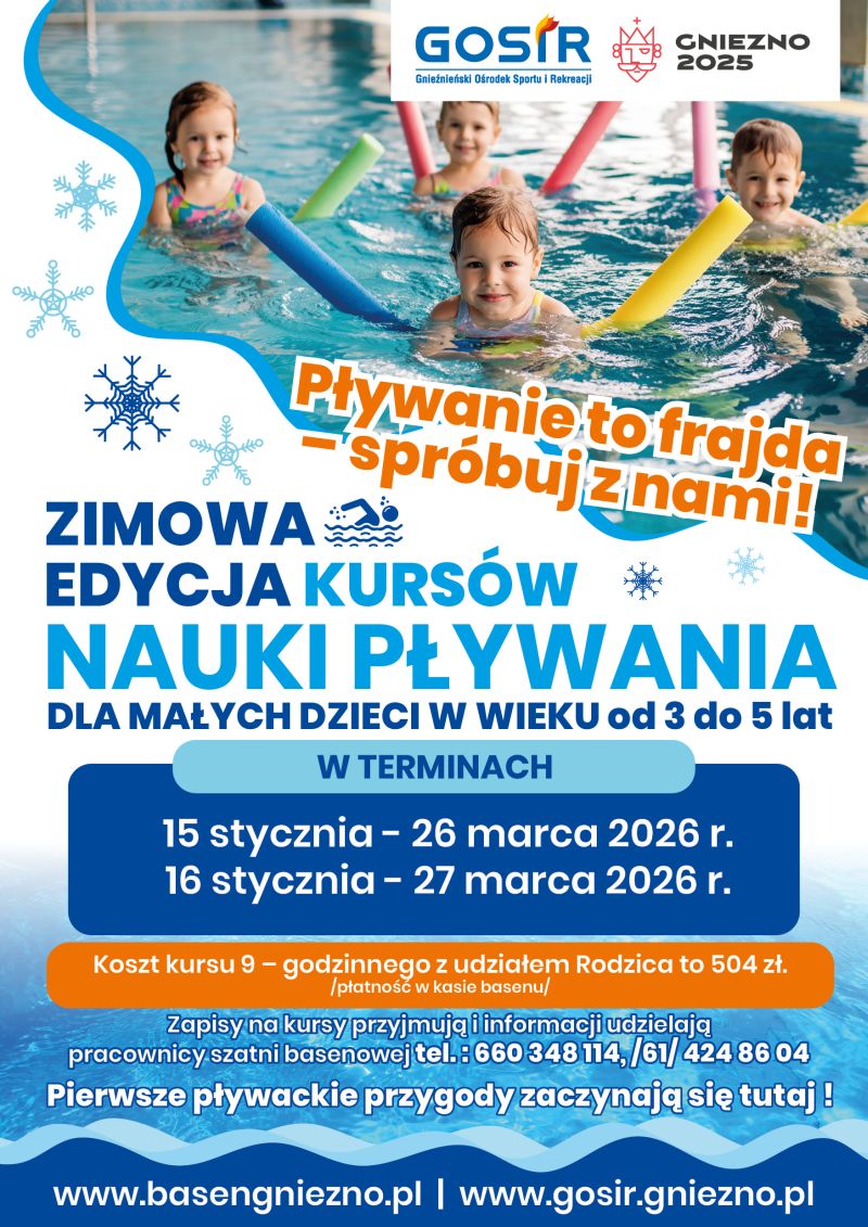 Pierwsze pływackie przygody zaczynają się na kursach pływania dla małych dzieci w Gnieźnieńskim Ośrodku Sportu i Rekreacji. Zapraszamy !